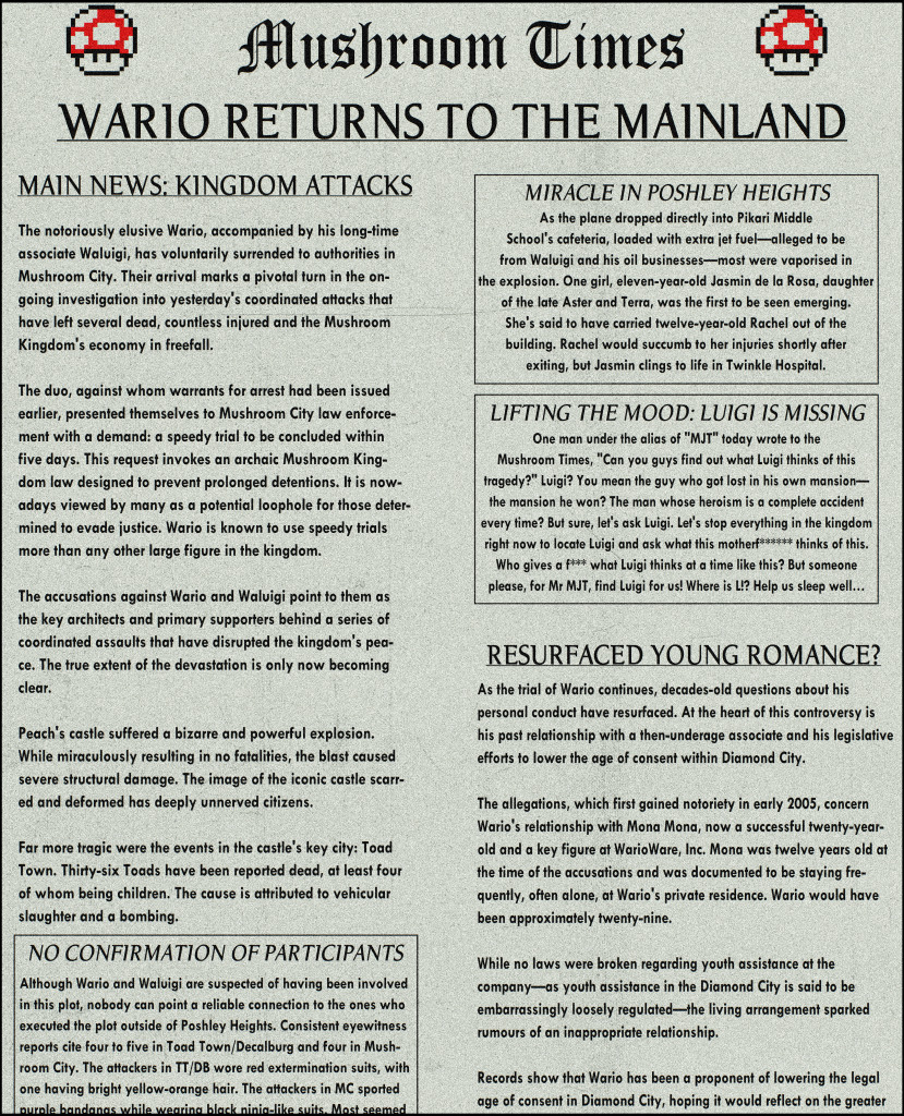 —Aunque el número de muertos es inferior a la tragedia del Festival de las Estrellas del año pasado, la escala y la coordinación de estos ataques han quebrado la serenidad del reino. Las autoridades han identificado a dos miembros de la familia criminal Scapelli como los pilotos de los jets en Villa Preciosa, lo que los lleva a sospechar que Wario y Waluigi son los autores intelectuales de este elaborado plan.